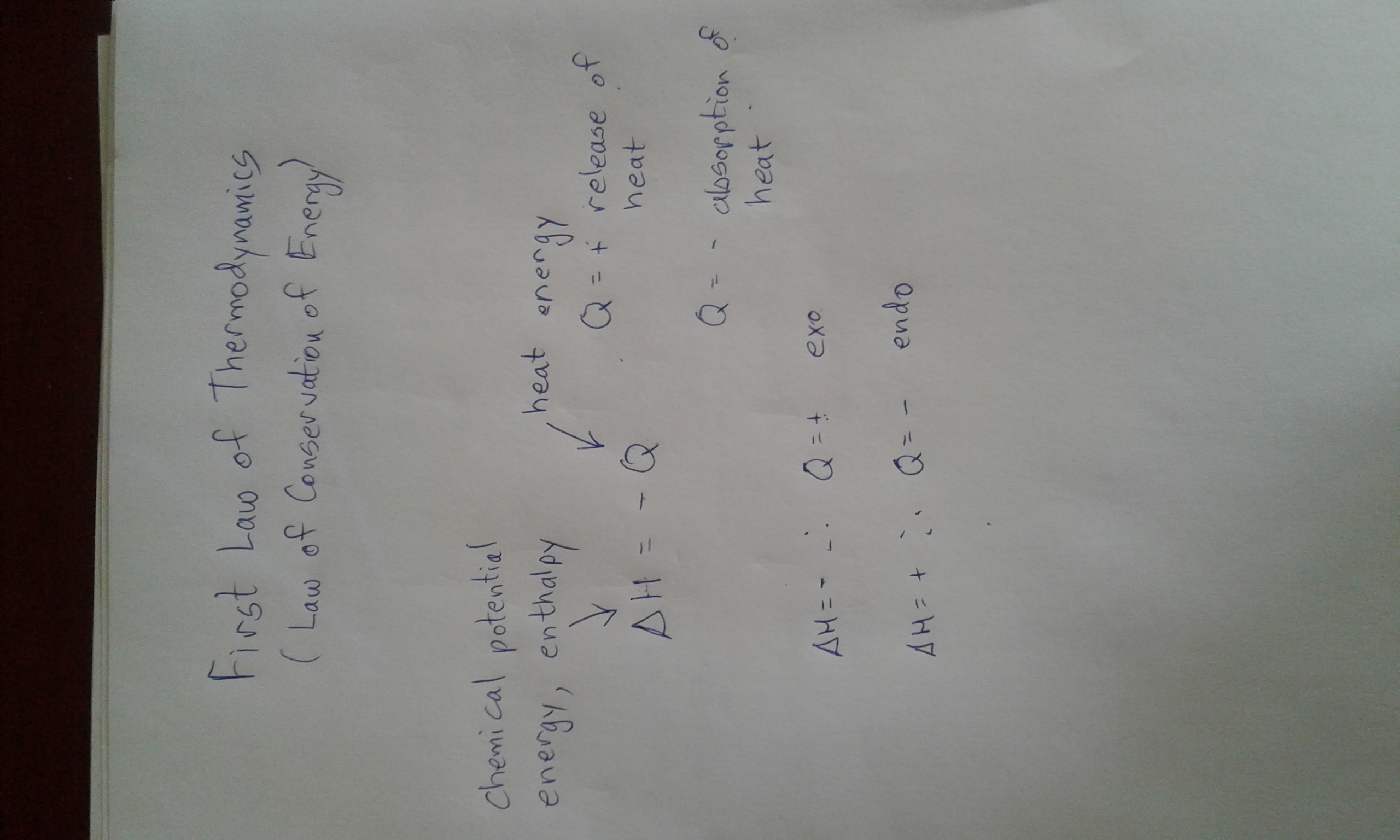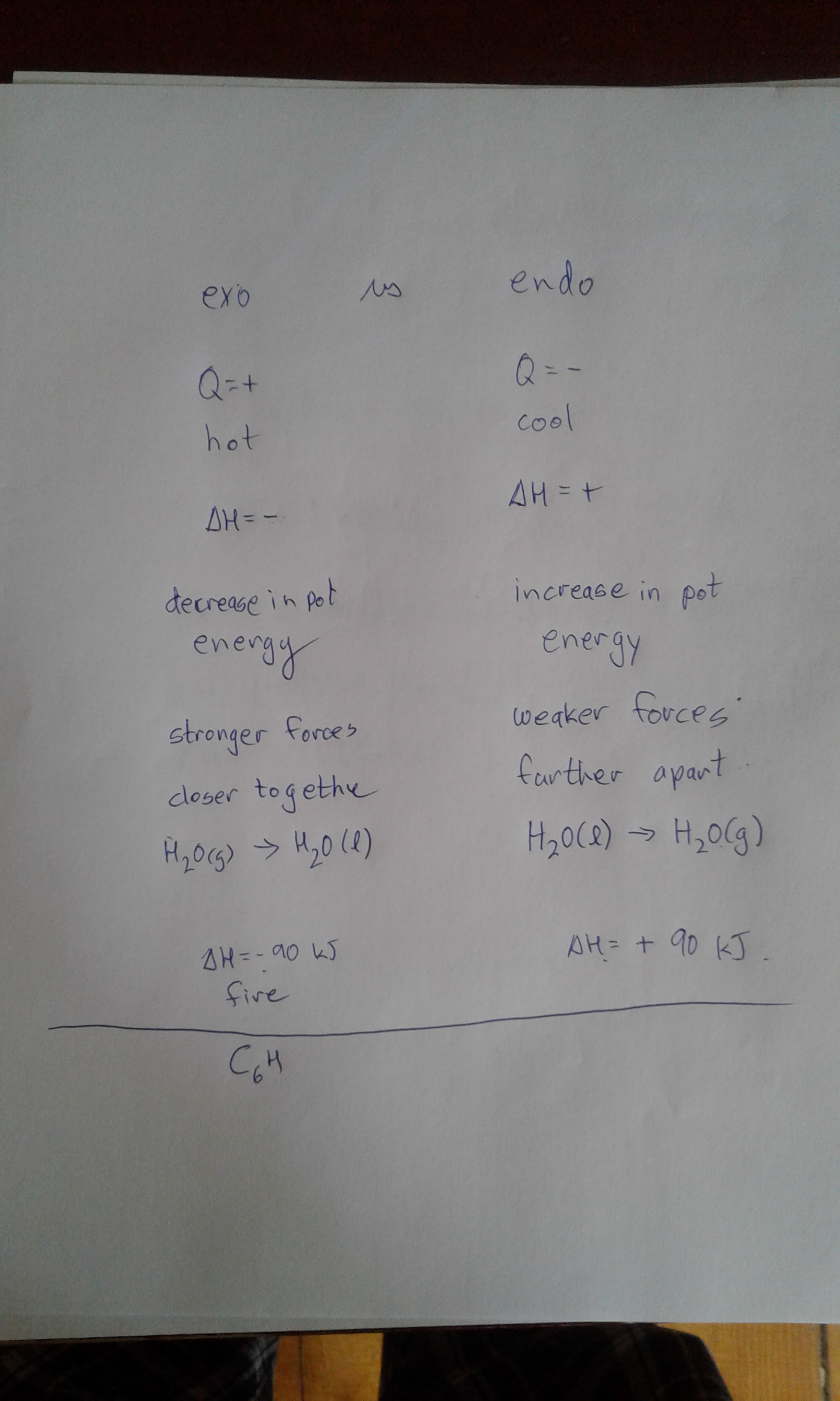 This concept can be very difficult. There are easy questions and hard. Endothermic means an increase in potential energy which means a + "Delta" H value (can't find the upside down triangle sign that is needed for "Delta"), - Q value, heat is aborbed could get cold or is at least preventing it form getting hot. Exothermic is the opposite. You will need to read through the note on heat and first law of thermodynamics to get a better sense of this. Please look at the enthalphy game test questions to get a better sense of this. The exothermic vs endothemic section in the thermodynamics summary has additional information.